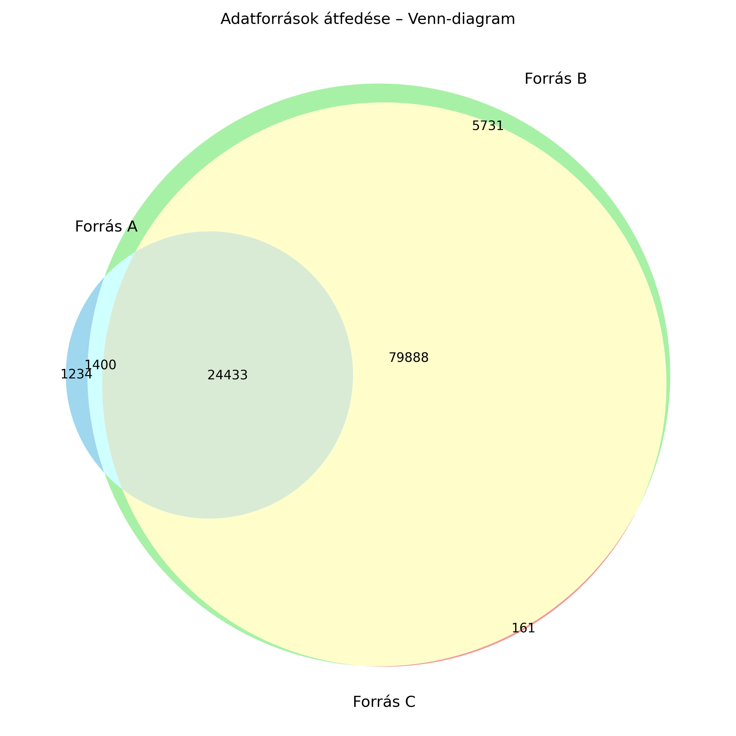 plot_and_save_vennfüggvény a matplotlib_venn csomaggal rajzolja meg a diagramot, az elemszámokat pedig a megfelelő körökben jeleníti meg.venn3( subsets=( len(s["only_a"]), len(s["only_b"]), len(s["a_and_b"]), len(s["only_c"]), len(s["a_and_c"]), len(s["b_and_c"]), len(s["all_three"]) ), set_labels=("Forrás A", "Forrás B", "Forrás C") )
